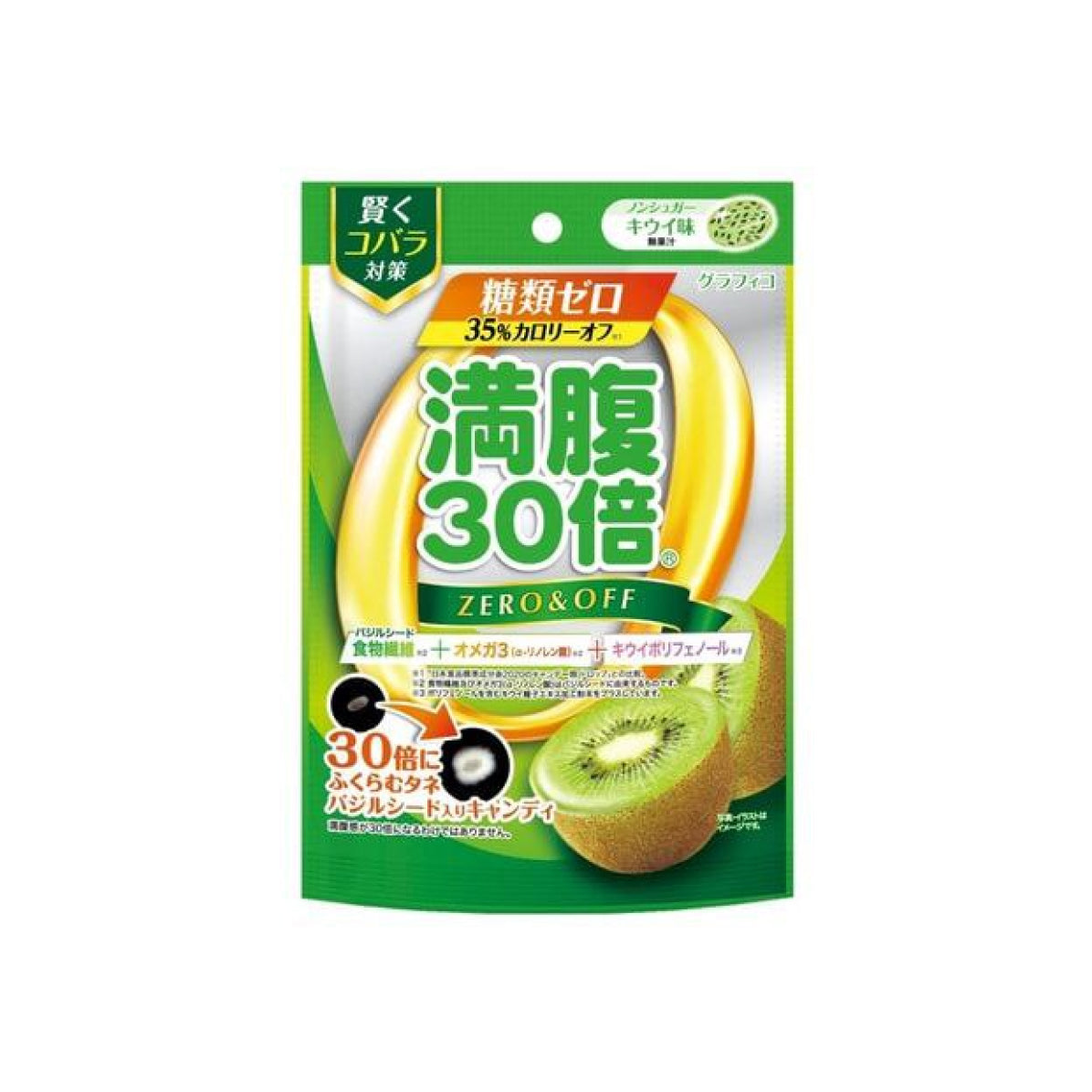 Цукерка зі смаком ківі, містить харчові волокна та омега-3 (α-ліноленову кислоту) у насінні базиліка, а також поліфеноли ківі.